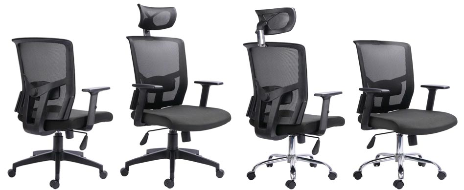 Silla Ejecutiva Ergonomica con espaldar en malla traslucida, apoyo lumbar graduable en altura y profundidad, cabecero graduable en altura y angulo, brazos graduables en altura.